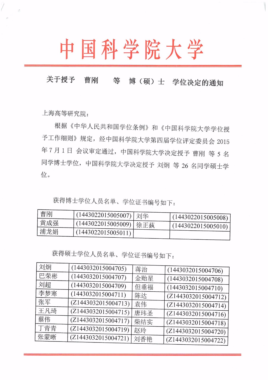 [学位授予公告]2015年夏季上海高等研究院博(硕)士学位授予名单