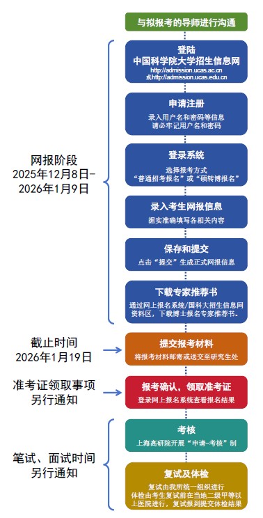 考生进行博士网上报名前务必要仔细阅读《中国科学院大学2026年博士研究生招生章程》《中国科学院大学2026年秋季入学博士研究生招生网上报名公告》以及《上海高研院2026年博士研究生招生章程》或报考通知等有关公告。