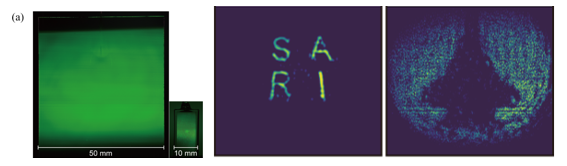 4. 扩大成像视场,推动系统走向实用化:针对成像面积受限的问题,提出了一种基于大尺寸原子气室和均匀激光整形的优化策略,实现了50mm × 50mm的大视场太赫兹原子成像。该系统有效扩展了探测视场,提高原子荧光分布的空间均匀性,使太赫兹量子成像从以往的毫米尺度验证,迈向更接近实际应用需求的系统尺度。进一步将该系统已成功应用于液体混合过程的可视化监测,展现出在化学检测与生物扩散过程分析中的潜力。