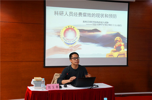 刘玉林以《科研人员经费腐败的现状和预防》为题,紧密结合当前的反腐形势和检察机关查办科研院所职务犯罪的情况,以生动的语言、通俗易懂的实例和自身积累的丰富工作经验,分析了当前科研经费腐败的主要特点及职务犯罪易发、多发的原因和环节,并对科研人员提出了预防职务犯罪保持廉洁的对策和建议,使在座职工深受启发和教育。