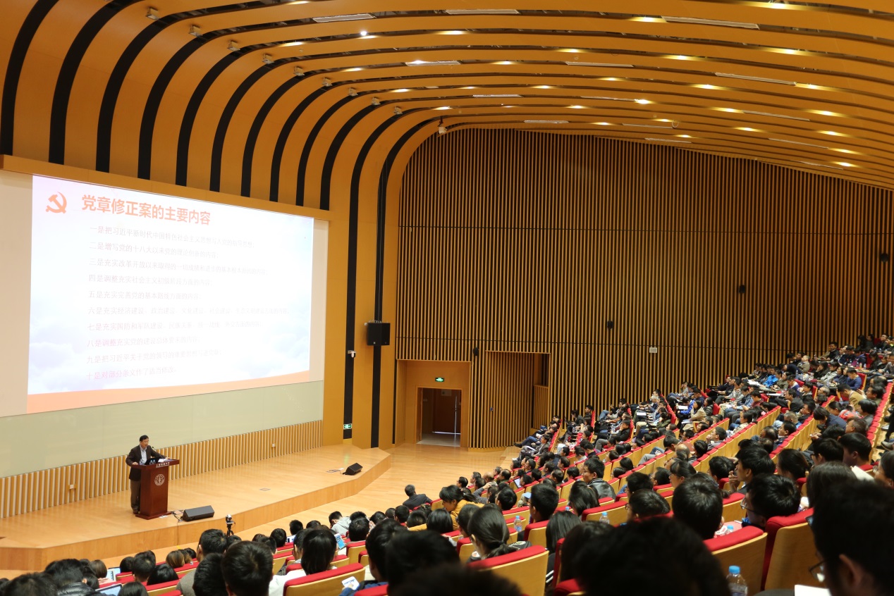 为认真学习和宣传贯彻党的十九大精神,上海高研院党委于10月30日下午,在上海科技大学报告厅举行了学习传达党的十九大精神报告会。会议由上海科技大学党委书记、上海高等研究院党委书记朱志远主持。高研院领导、两委委员、中层干部、党支部委员、正高级研究人员近70人参加了会议。上海光源、国家蛋白质科学中心、微小卫星创新研究院、上海科技大学约280人同时听取了报告。