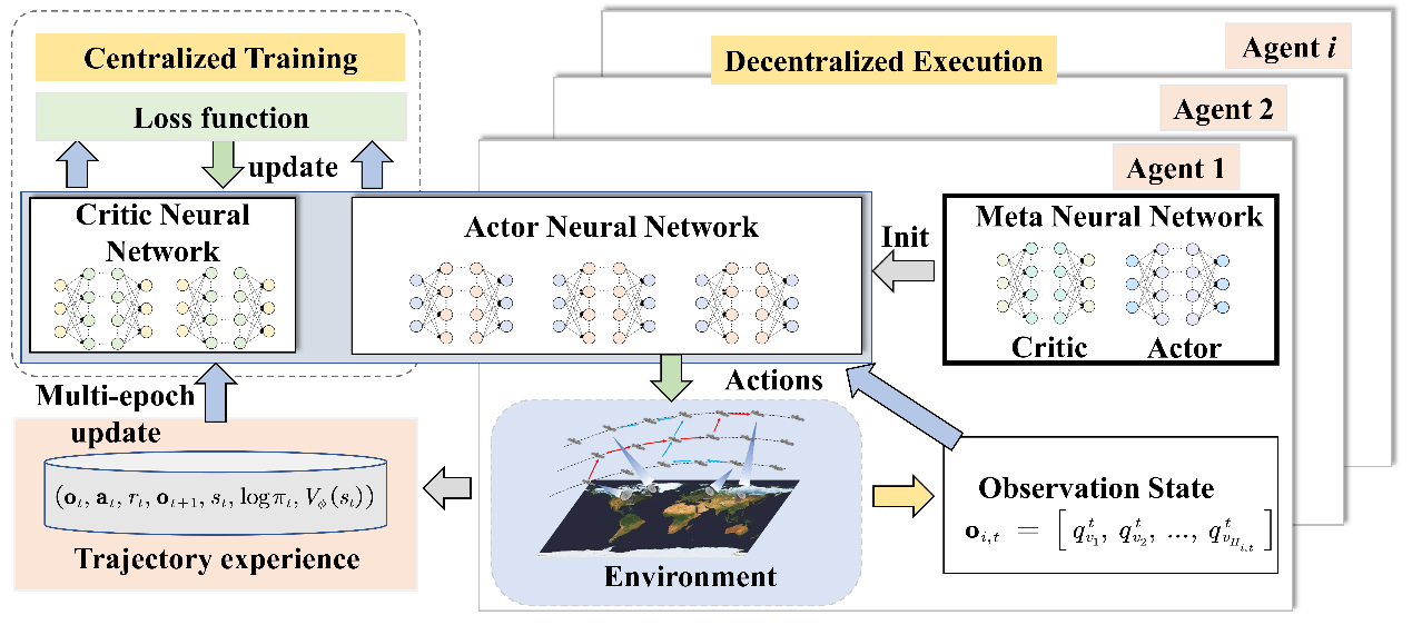针对上述挑战,中国科学院上海高等研究院(以下简称“上海高研院”)智能信息中心下一代移动通信网络团队,面向星地融合网络多路径路由实时选择问题,提出了一种基于元强化学习的多智能体协同技术,实现了在动态卫星网络环境下的高效路径选择与自适应路由优化。相关成果以 Meta-Reinforcement-Based Multipath Selection in Satellite-Ground Integrated Networks 为题,发表于无线通信领域国际期刊 IEEE Internet of Things Journal。