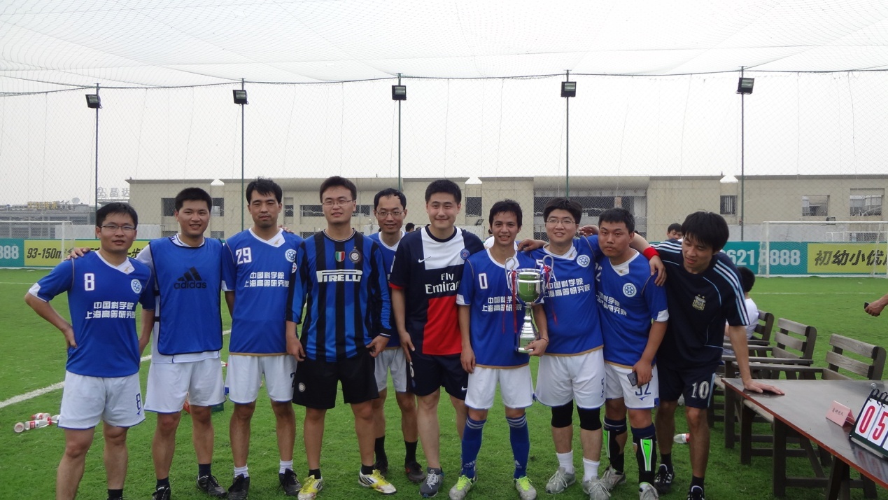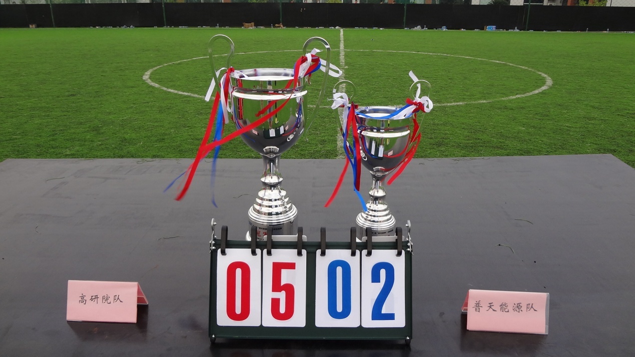 上海高研院副院长黄伟光及普天能源总经理沈忠华参加了本次赛事的开幕式,并由黄伟光为本次赛事进行开球,经过激烈的奋力拼搏,上海高研院足球队以“5比2”取得比赛胜利,夺得本次“普天中科2014年联谊活动之足球友谊赛”冠军,赛后沈忠华为上海高研院足球队颁发了冠军奖杯。通过本次比赛上海高研院足球队赛出了风格、赛出了水平、赛出了友谊,为本次世界杯来临之际,上海高研院足球活动的开展和精神文明建设打开了一个良好的局面。