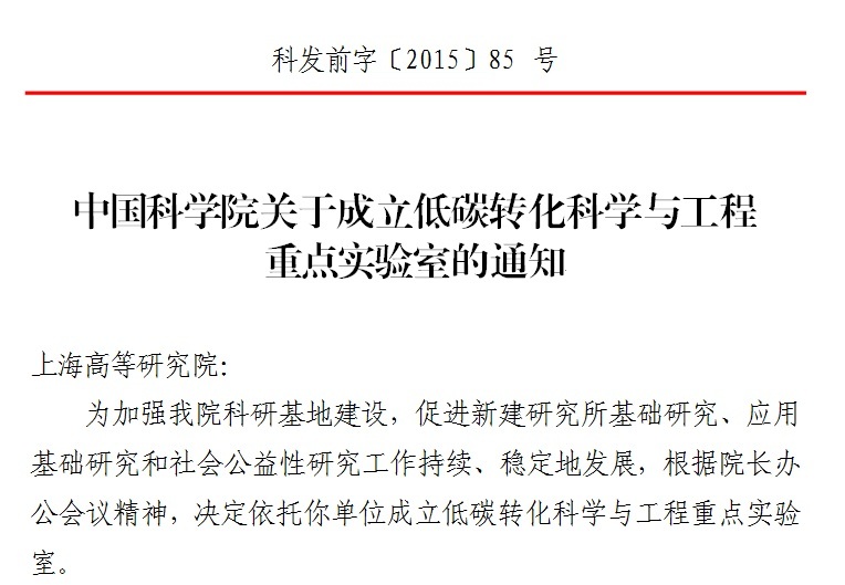 2015年6月5日,中科院前沿局印发科发前字〔2015〕85 号文件,正式批准成立“中国科学院低碳转化科学与工程重点实验室”。