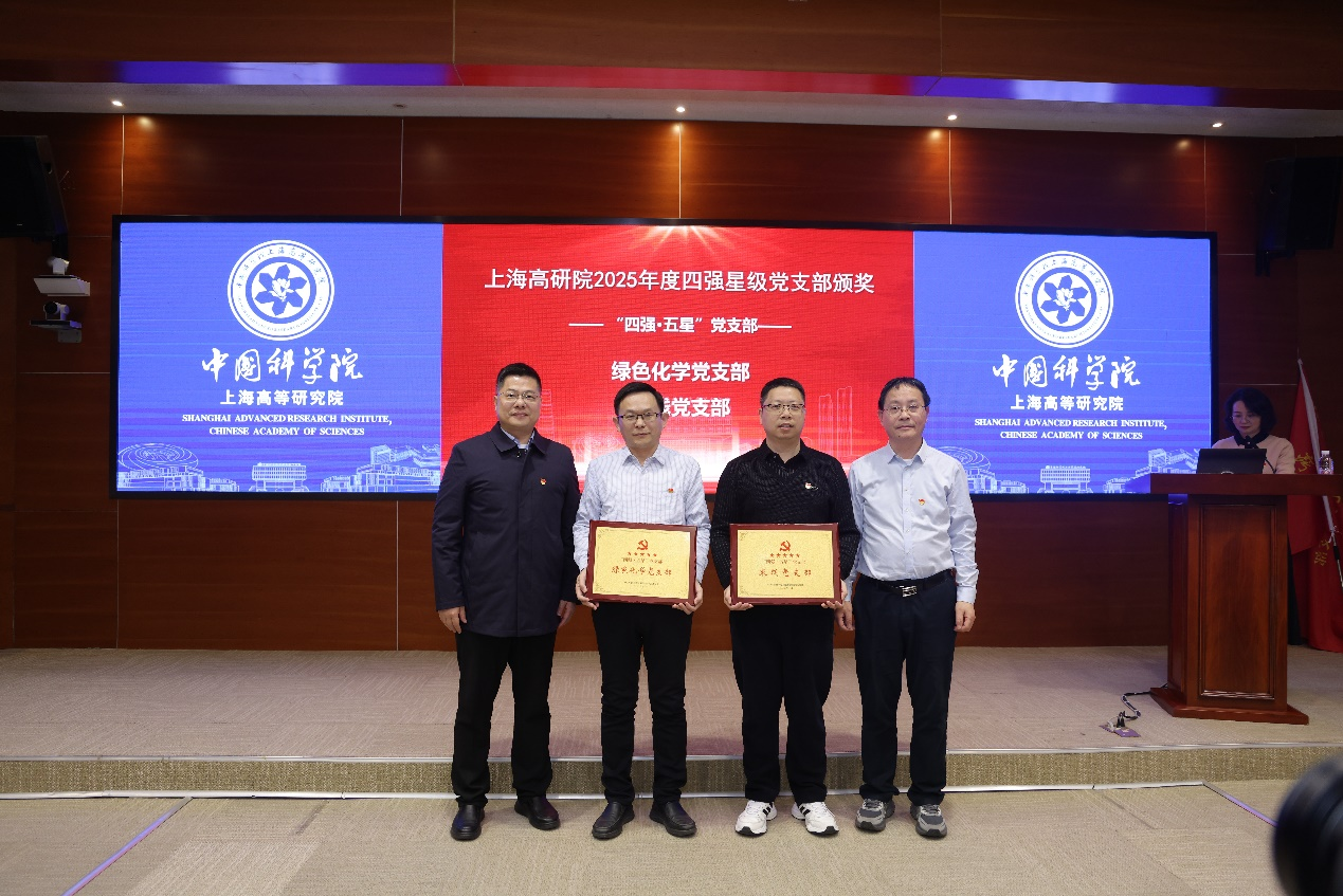在热烈的掌声中,党委书记陈丰伟为绿色化学党支部和束线党支部颁发“四强·五星”党支部奖牌,并向“烷基萘中试生产攻坚突击队”和“秉志凝光·光束线智能寻优青年先锋队”两支攻关突击队授旗。