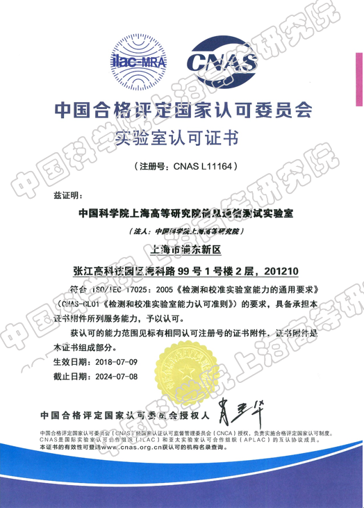 2018年7月9日,中国科学院上海高等研究院信息通信测试实验室(以下简称“实验室”)通过严格审定,正式获得“中国合格评定国家认可委员会”(简称CNAS)授予的CNAS实验室认可证书,证书编号:CNASL11164。